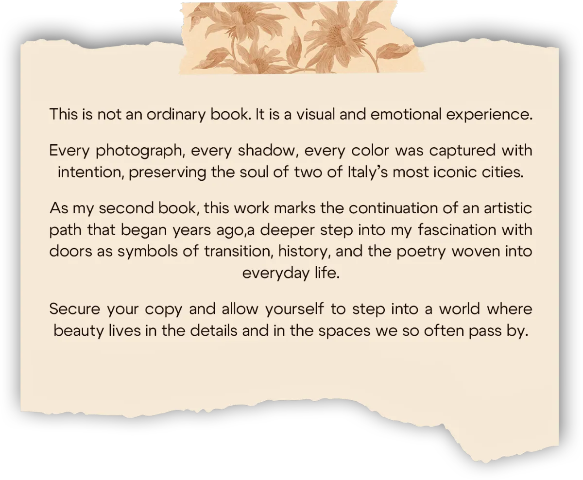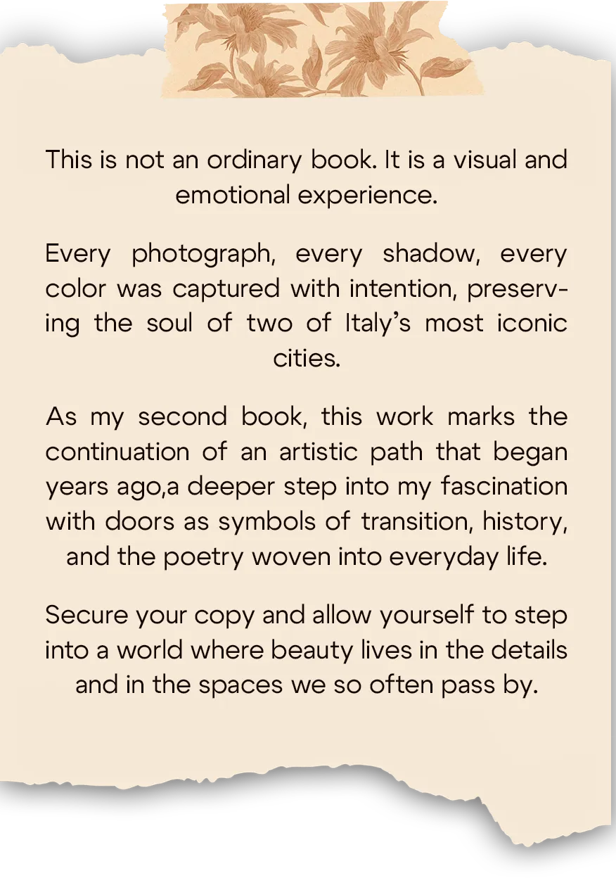It is a visual experience, built from original photographs of doors in Rome and Florence, each one a small story of time, culture, and silent meaning.